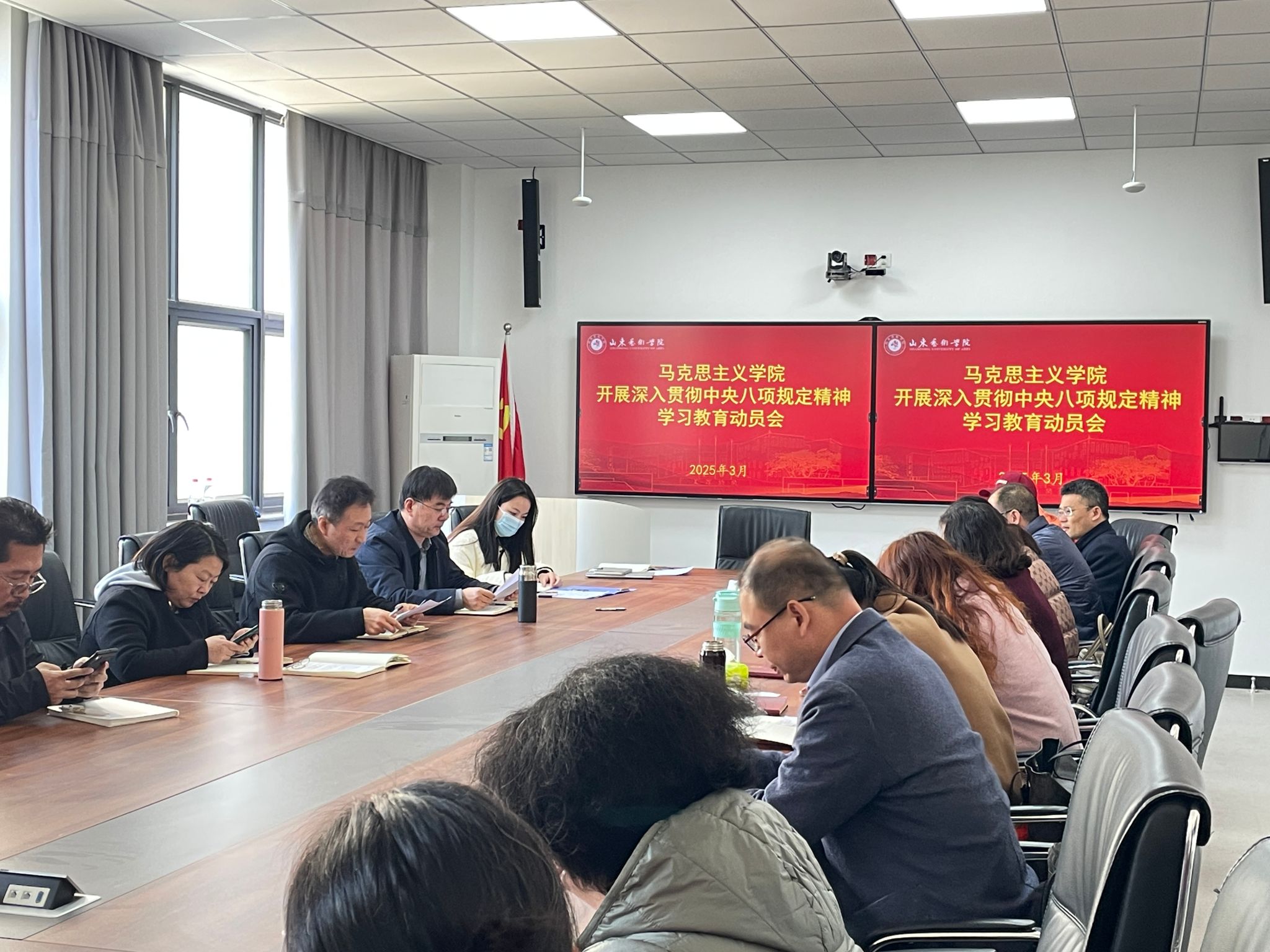 3月19日下午,马克思主义学院在学院会议室召开深入贯彻中央八项规定精神学习教育动员会。会议由学院党总支书记张有平主持,学院院长王众,副院长张苓及全体教师党员参加会议。